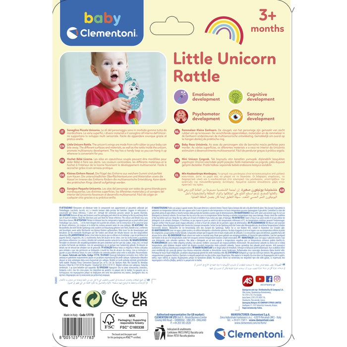 Un simpatico sonaglino a forma di unicorno con colorate parti in gomma morbida e sicura per favorire la dentizione.