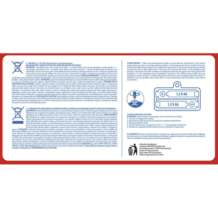 Il prodotto è conforme alla pertinente normativa comunitaria di armonizzazione: Direttiva 2009/48/CE. Attenersi a quanto riportato su scatola e istruzioni per il corretto e sicuro utilizzo del gioco.