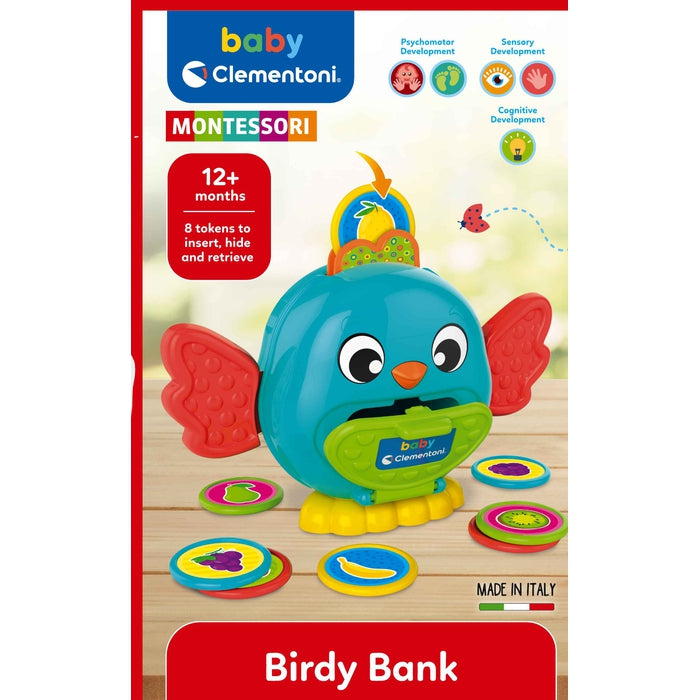 L'uccellino è un simpatico salvadanaio in cui inserire i gettoni colorati per poi riprenderli aprendo lo sportellino sul pancino.