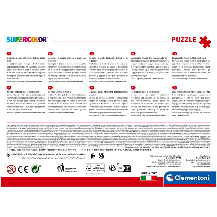 Da sempre sensibile al problema dell'ecologia, la Clementoni fa un largo uso di materiali riciclati, evitando l'impiego di componenti inquinanti. Made in Italy.