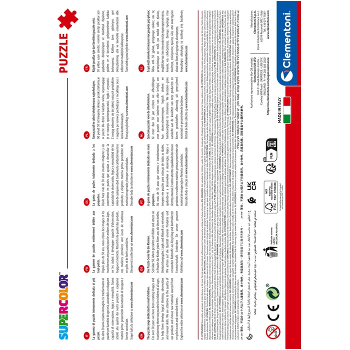 Da sempre sensibile al problema dell'ecologia, la Clementoni fa un largo uso di materiali riciclati, evitando l'impiego di componenti inquinanti. Made in Italy.