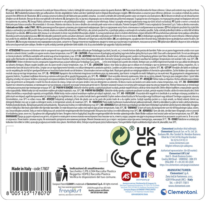 Un nuovo secchiello clemmy con coperchio morbido, arricchito di textrure ed incastri per giocare con i 15 mattoncini inclusi.