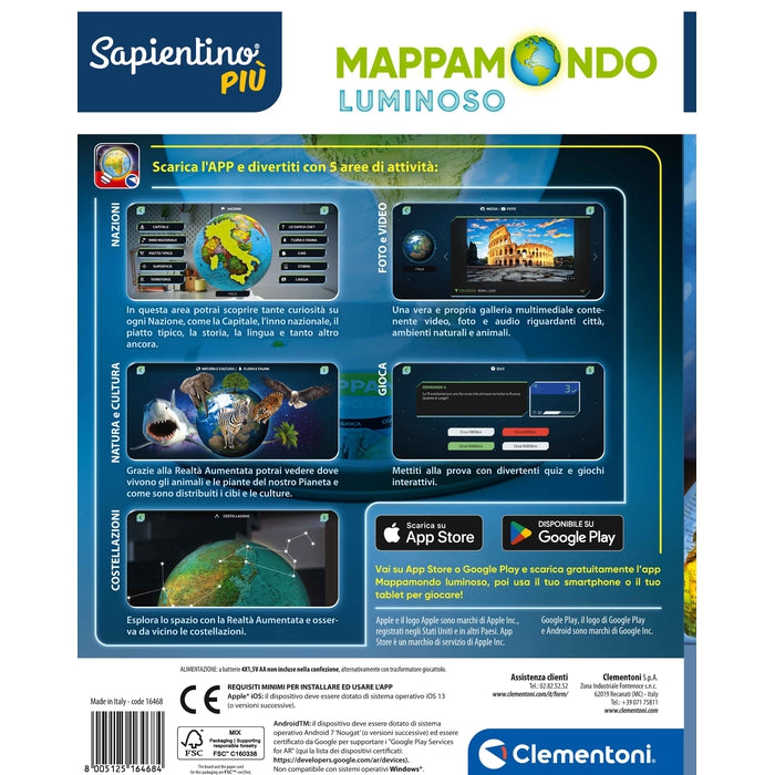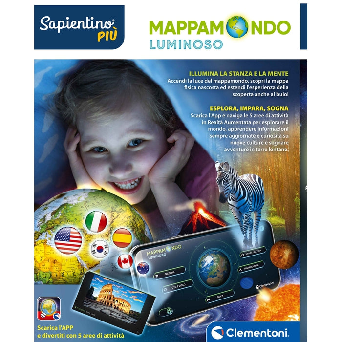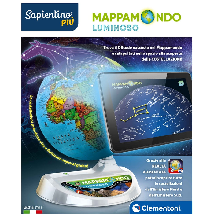 Dotato di LED interno: a luce spenta appare la cartografia politica, a luce accesa la rappresentazione diventa fisica.