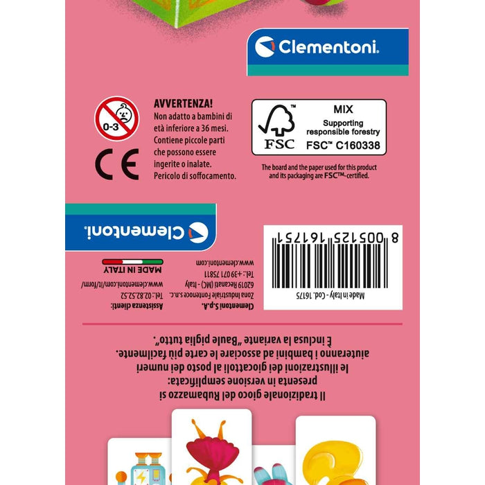 Contiene 40 carte da gioco con illustrazioni di giocattoli al posto dei numeri, per aiutare il bambino ad associare le carte attraverso le figure.